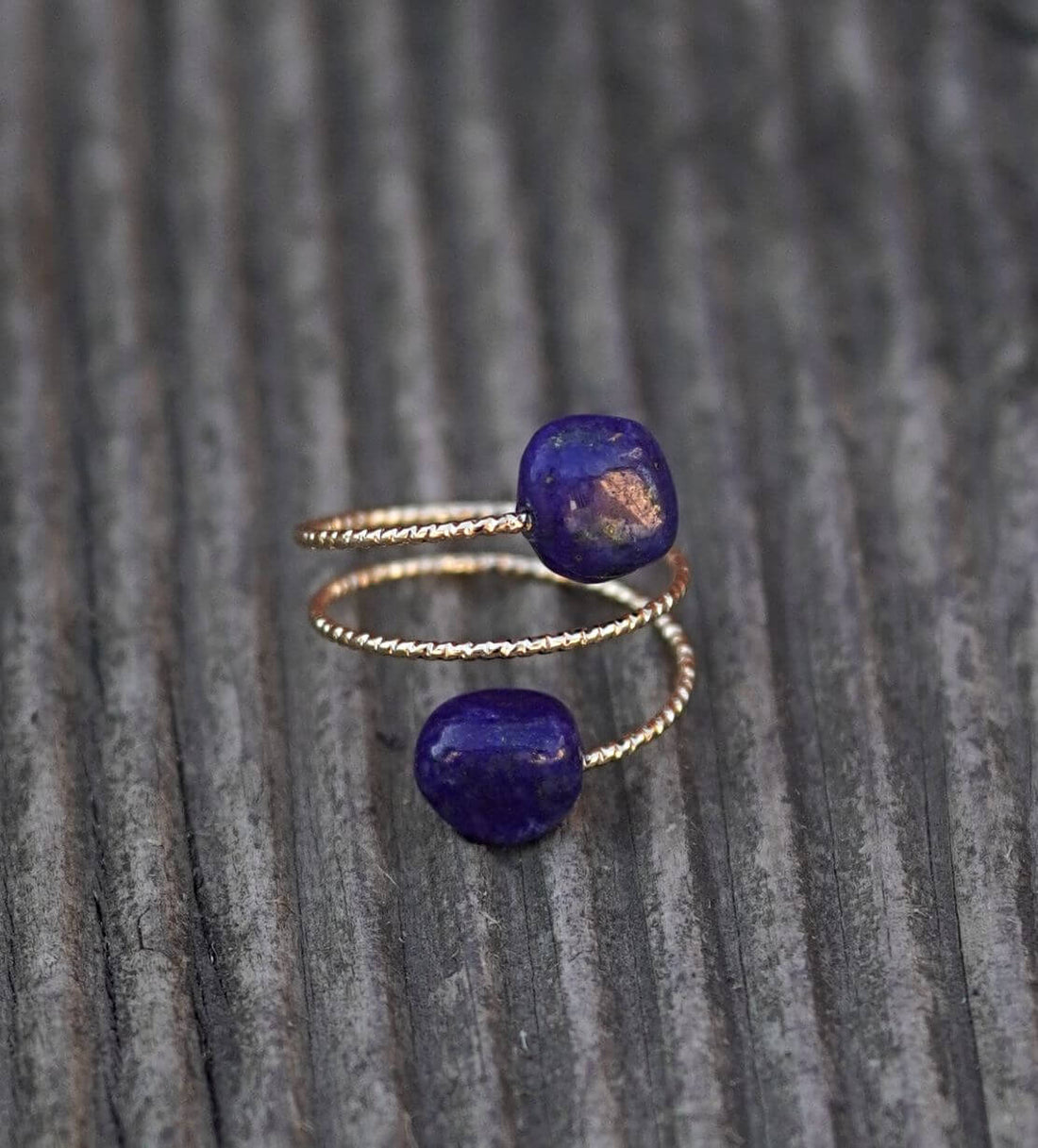 Acest inel delicat, cu pietre naturale de Lapis Lazuli în formă neregulată, montate pe o...