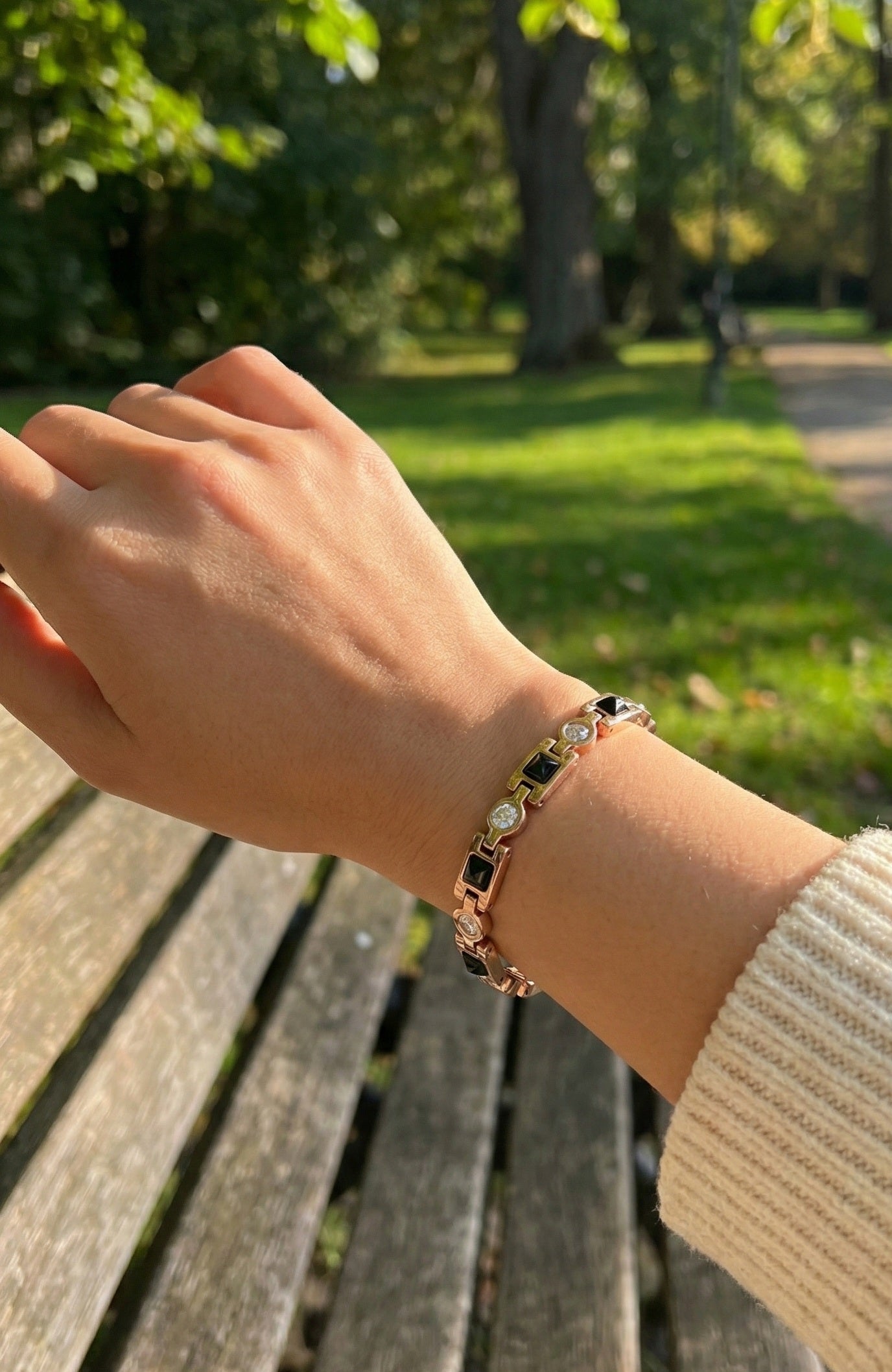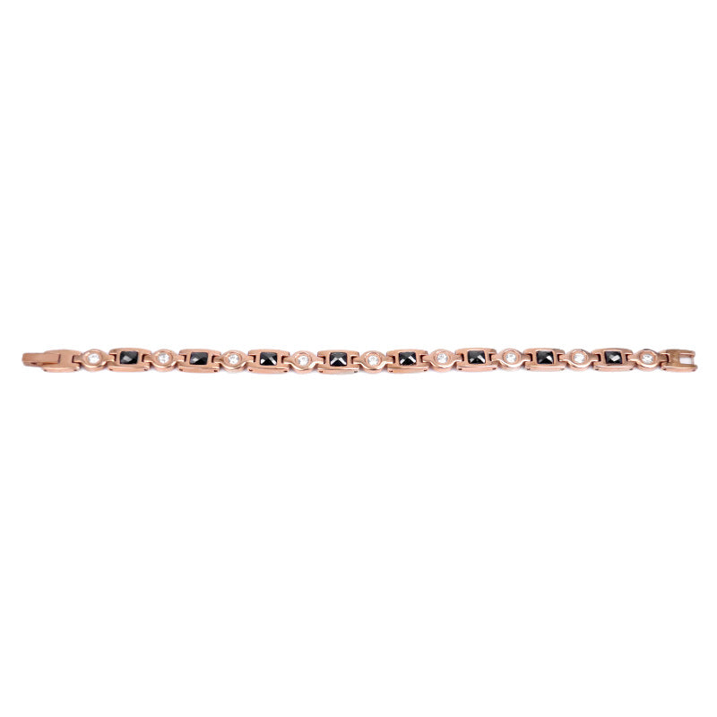 1. Design Geometric Rafinat Piesa se distinge printr-un joc vizual superb: zalele rectangulare cu inserții negre (tip onix) alternează armonios cu elemente circulare încrustate cu cristale fine de Zirconiu. Finisajul lucios Rose Gold adaugă o notă de lux și feminitate, transformând brățara într-o piesă statement care poate fi purtată atât la o ținută office, cât și la o rochie de seară sau o ținută casual în parc.