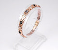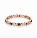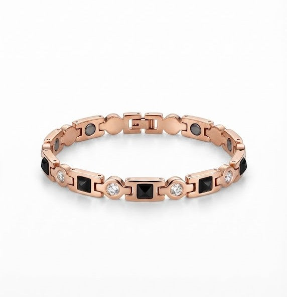 Descoperă accesoriul care ține pasul cu ritmul tău de viață. Brățara "Be Fit" a fost creată pentru femeia modernă, care nu face compromisuri între stil și starea de bine. Cu un design sofisticat în nuanțe de Rose Gold și accente de negru intens, această bijuterie ascunde un secret al vitalității: terapia magnetică discretă.