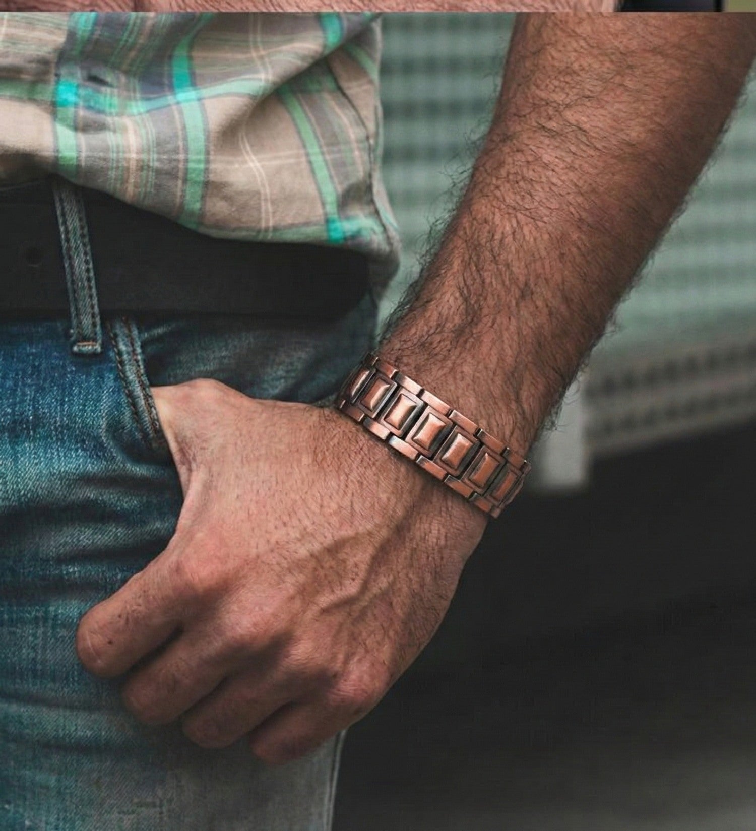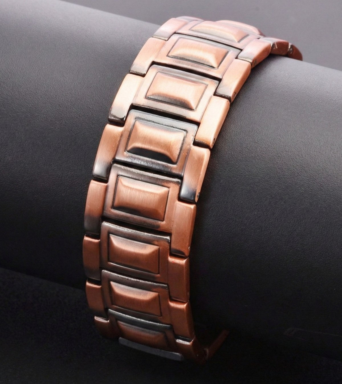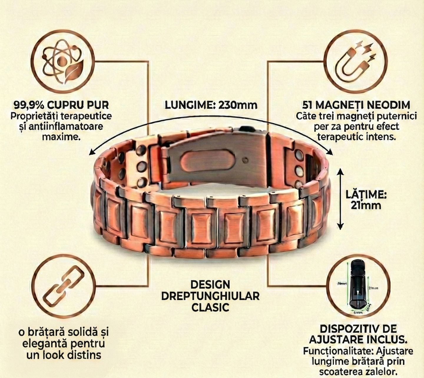 Combinația Cupru + Magneți: Dincolo de aspect, este un accesoriu funcțional. Cuprul este purtat din vechime pentru potențialele sale efecte asupra stării de bine, iar inserțiile magnetice de pe interior sunt apreciate pentru îmbunătățirea circulației locale și relaxare.