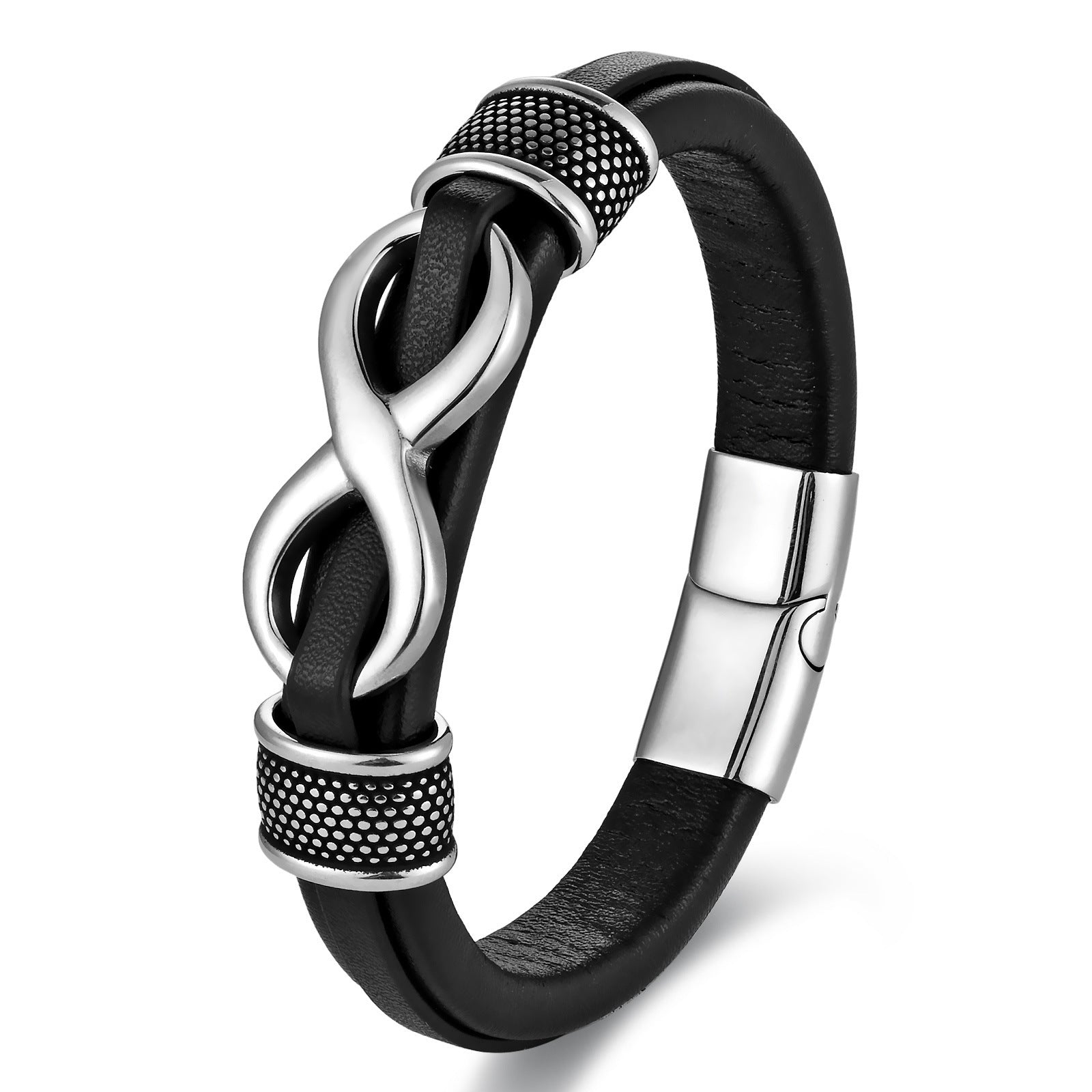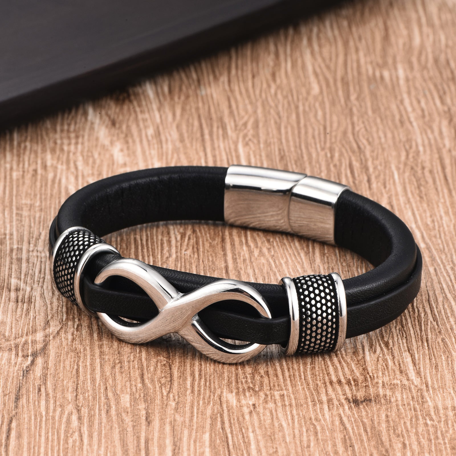 Brățara Infinite Silver este o fuziune perfectă între textura brută a pielii naturale negre și strălucirea rece a oțelului inoxidabil. Cu un design impunător centrat pe simbolul eternității, acest accesoriu adaugă o notă de rafinament și forță discretă oricărei ținute masculine moderne.
