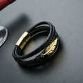 Brățara Golden Feather combină eleganța modernă cu simbolismul profund al libertății. Realizată din piele naturala neagră,in 5 straturi, brățara este accesorizată cu o pană metalică aurie, ce reprezintă libertatea, ascensiunea și spiritul liber