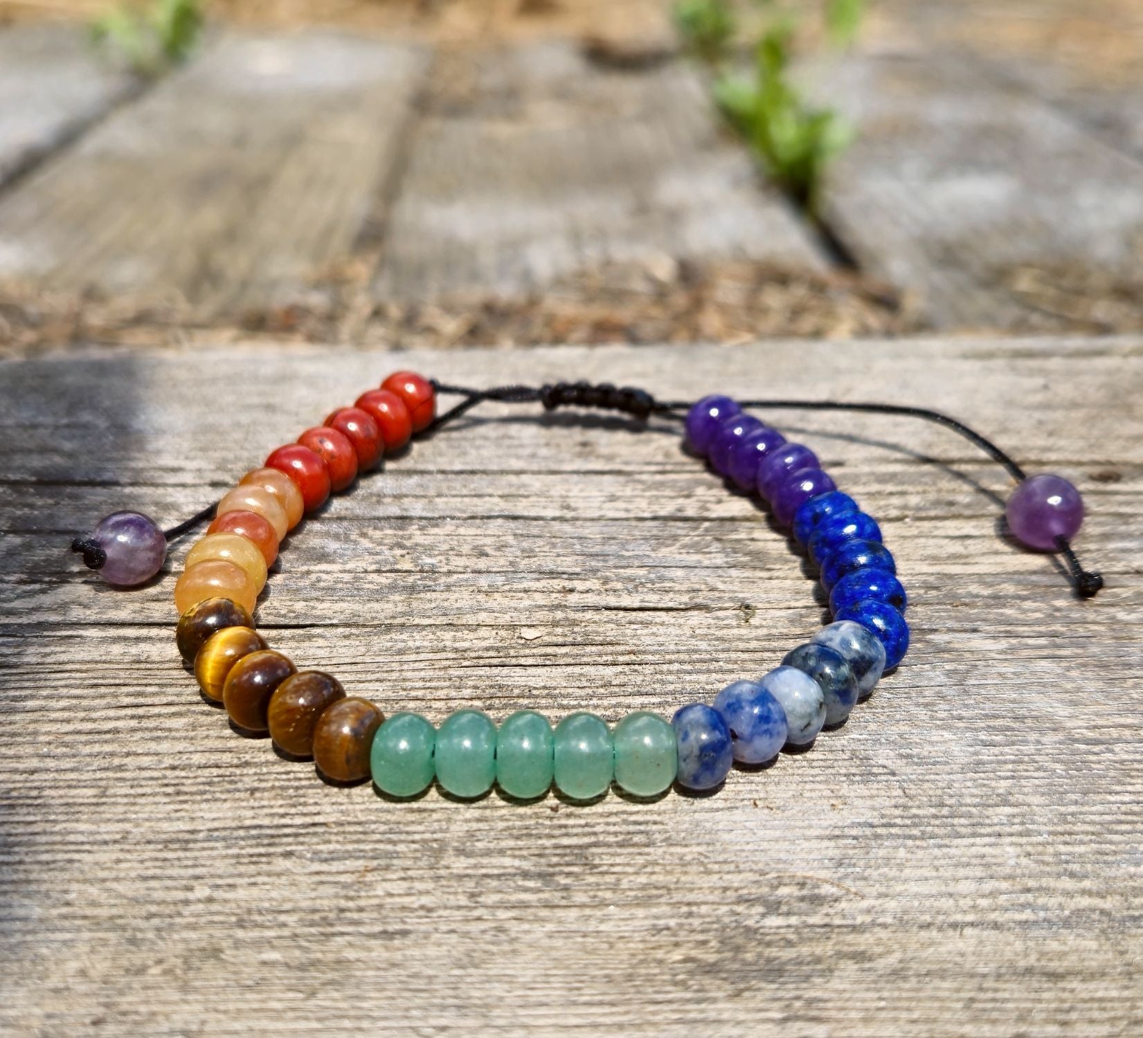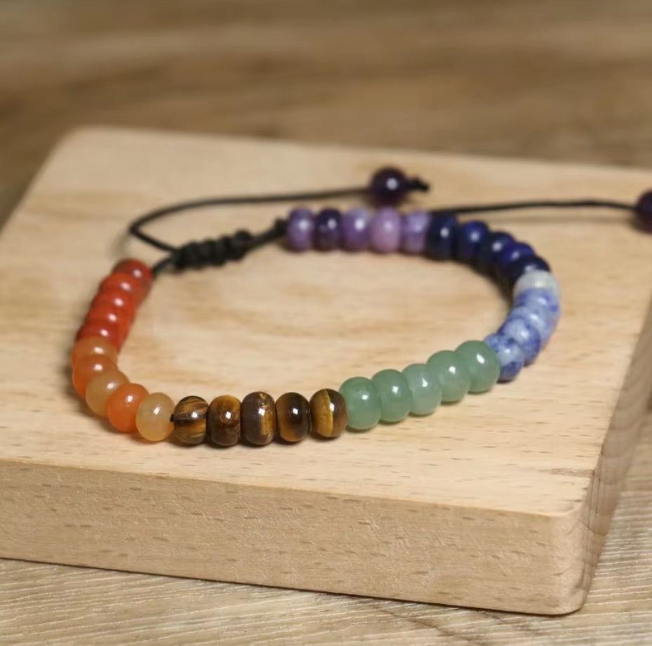 Această brățară din pietre naturale echilibrează cele 7 chakre și aduce claritate, curaj și liniște interioară. Cu un design armonios și un șnur reglabil, este ghidul tău zilnic spre echilibru și protecție spirituală.