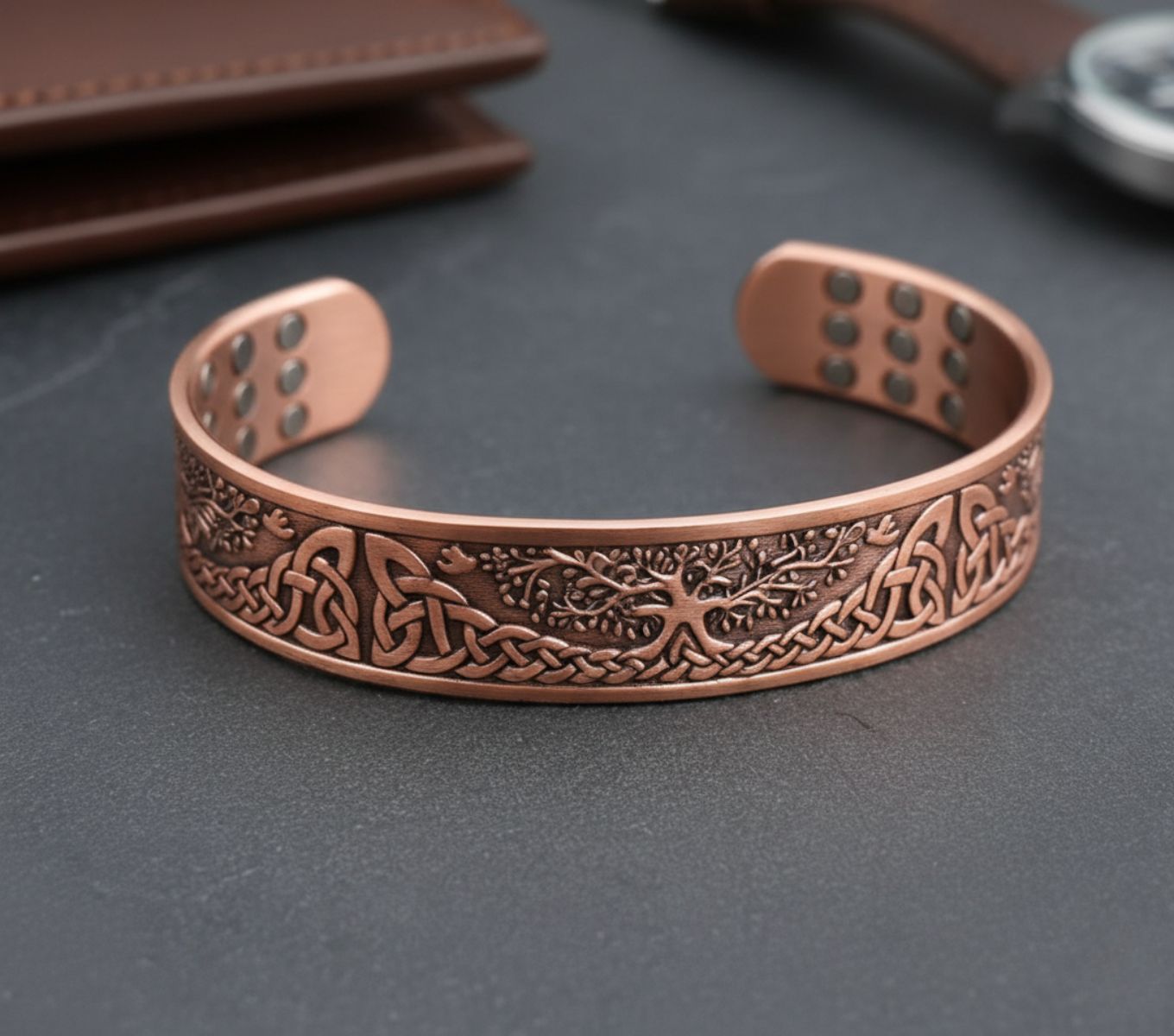 Redescoperă forța și moștenirea mitologiei nordice cu brățara din cupru "Copacul lui Thor"cu 27 de magneti neodim. Acest accesoriu remarcabil pentru barbati combină simbolul sacru al copacului vieții cu motivele puternice ale culturii vikinge, inspirate de Thor, zeul tunetului și al forței.