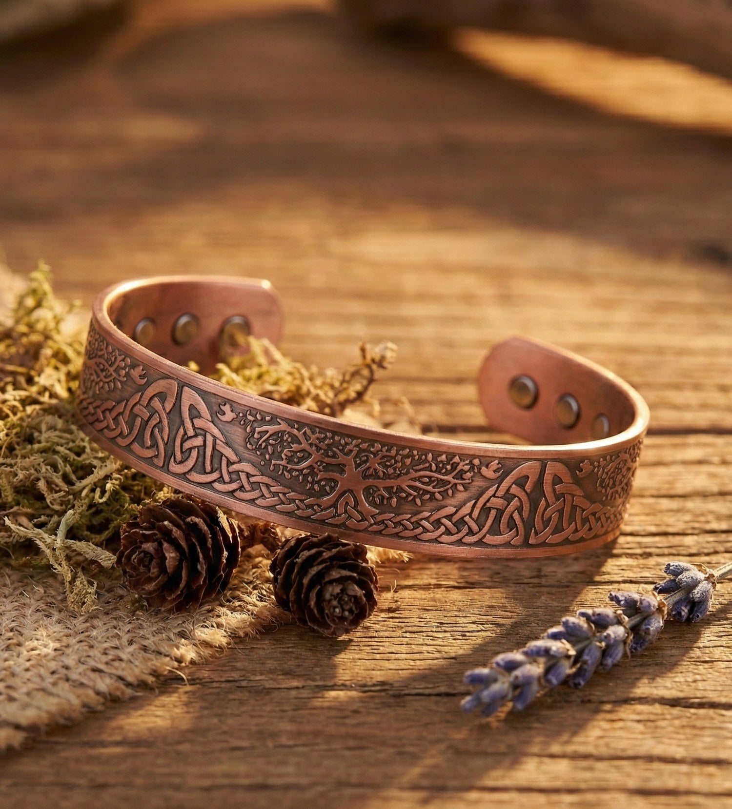 Descoperă legătura dintre forța mitologiei nordice și eleganța cuprului cu brățara "Copacul lui Thor" cu 12 de magneti de neodim. Designul său complex îmbină simbolul sacru al copacului vieții cu motive vikinge, inspirate de zeul tunetului și al forței, Thor.