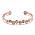 Descoperă fuziunea perfectă dintre eleganță și starea de bine cu brățara "Diamond Glow". Această piesă remarcabilă transcende conceptul clasic de brățară terapeutică, transformându-l într-o veritabilă bijuterie. Numele său este pe deplin justificat de cele 8 cristale de zirconiu (Cubic Zirconia), tăiate cu măiestrie, care aduc o strălucire comparabilă cu a diamantelor pe suportul solid din cupru pur. Este accesoriul ideal pentru cineva care dorește să combine beneficiile tradiționale ale magnetoterapiei cu un look sofisticat și strălucitor.