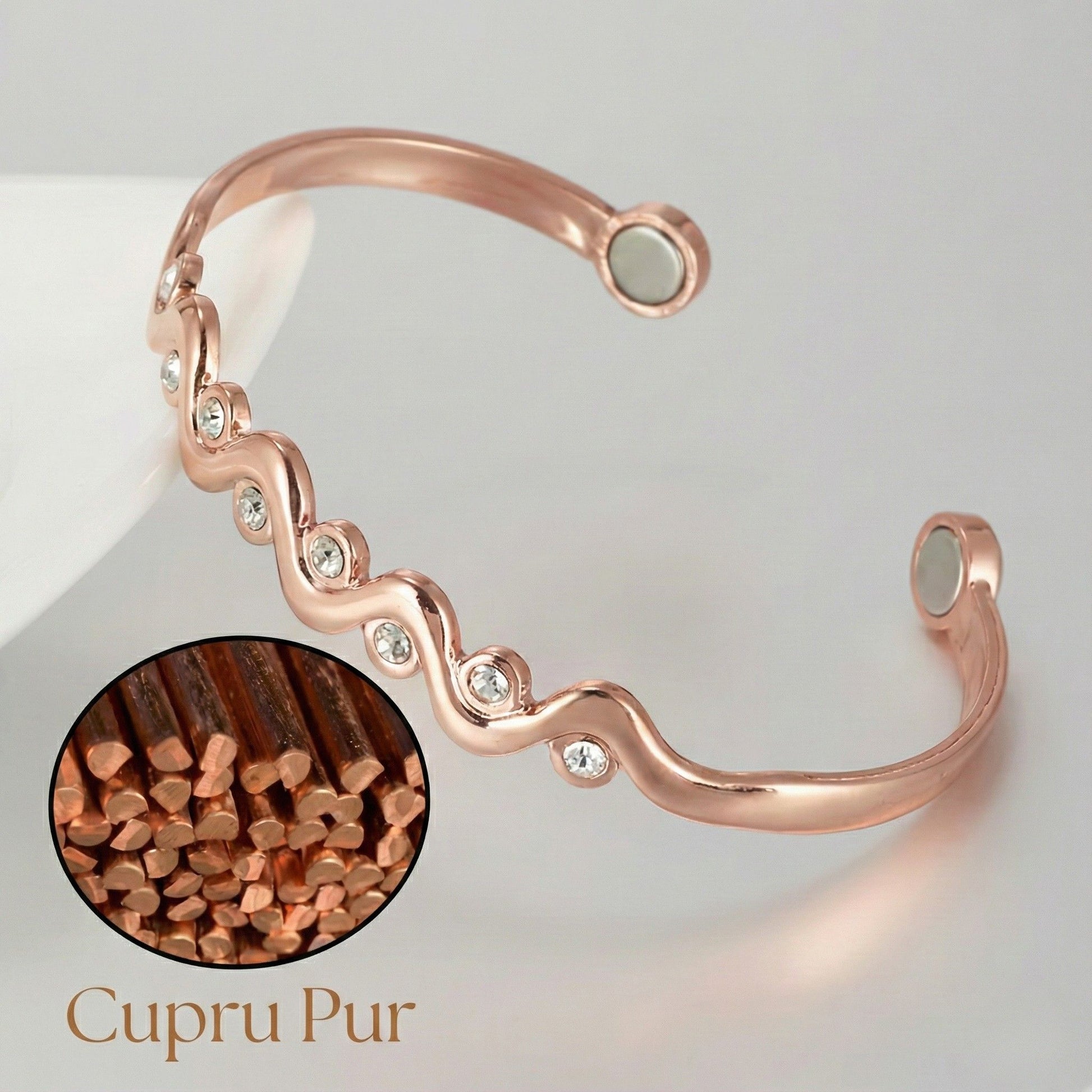 - Cupru Pur (99.9%): Baza brățării este confecționată din cupru solid, un metal nobil apreciat din antichitate pentru proprietățile sale și interacțiunea benefică cu organismul uman.