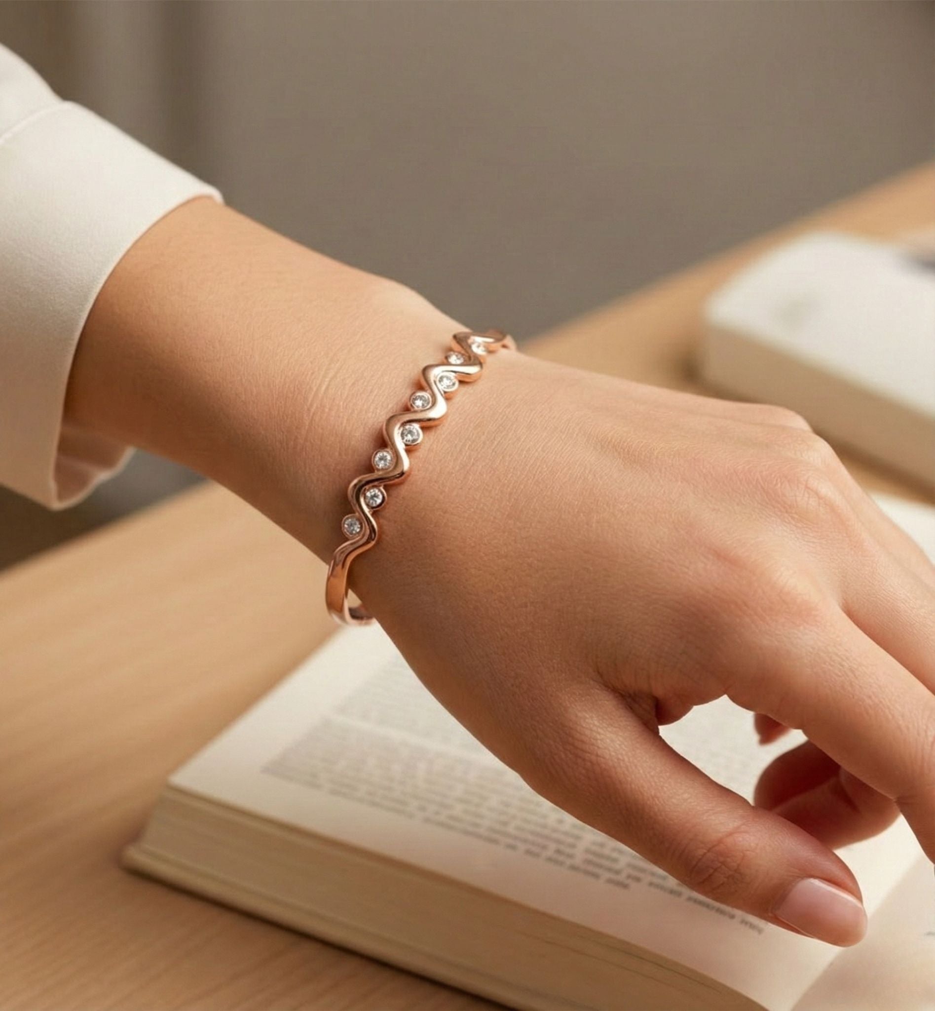 Cristalele de zirconiu sunt durabile, iar cuprul este un metal "viu". Este natural ca în timp cuprul să oxideze ușor sau să lase o patină verzuie inofensivă pe piele (semn al autenticității). Pentru a menține strălucirea "Diamond Glow" a cristalelor și a metalului, ștergeți periodic brățara cu o cârpă moale pentru bijuterii.