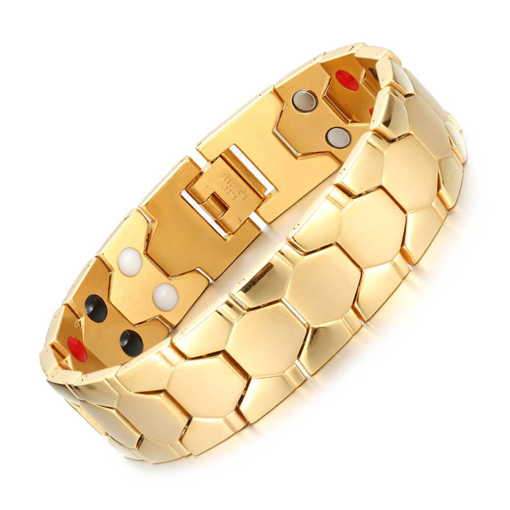 "Gold Power" este brățara magnetică cu design tip fagure auriu, care combină eleganța masculină cu o tehnologie terapeutică avansată, ce include magneți, germaniu, infraroșu și anioni. Susține circulația, reduce stresul și a adăuga un plus de vitalitate și stil fiecărei zile.