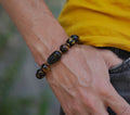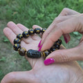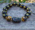 O brățară ce combină un Pi Xiu sculptat din obsidian auriu strălucitor și două mărgele de ochi de tigru maro intens, simboluri ale protecției și prosperității. Mărgelele negre cu mantre aurii aduc o vibrație spirituală profundă, atrăgând bogăție și armonie.