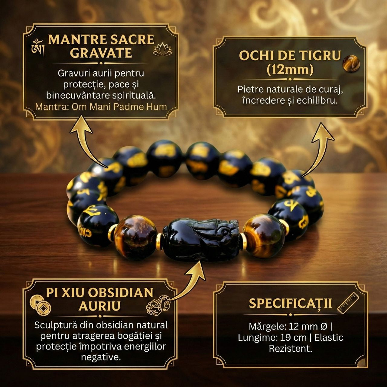 Bratara Feng Shui cu Pi Xiu din Obsidian Auriu si Mantre Norocoase