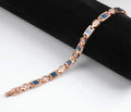 Această bratara rafinată este confecționată din Oțel Inoxidabil 316L, placată cu Aur 18K, și este împodobită cu cristale/zirconii de un albastru ceresc. Designul șic include elemente bio-active (Infraroșu Îndepărtat, Ioni Negativi, Germaniu), oferind suport pentru stare de bine, energizare și vitalitate.