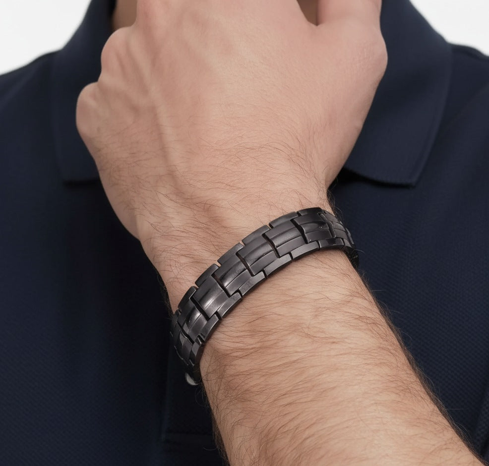 Vital Force Black", o brățară magnetică elegantă din cupru, proiectată ca un partener pentru vitalitatea dumneavoastră. Este echipată cu patru tehnologii terapeutice esențiale: magneți puternici de neodim, germaniu pur, infraroșu îndepărtat și ioni negativi (anioni). Purtarea acesteia ajută la combaterea efectelor stresului, susține un flux sanguin sănătos și contribuie la un sentiment general de vigoare și echilibru..
