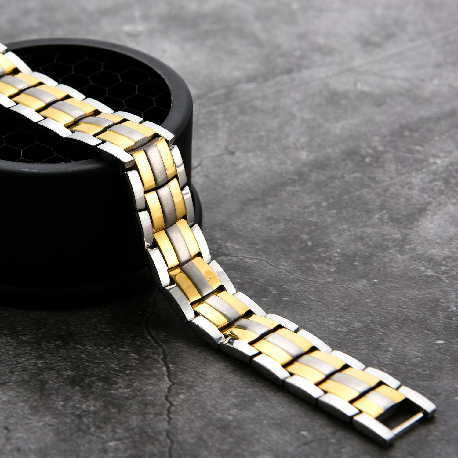 Modelul Royal Zen reprezintă o fuziune între ingineria materialelor și principiile magnetoterapiei. Construită din zale articulate, brățara prezintă un design dual-tone, alternând oțelul inoxidabil cu finisaj satinat și inserții placate auriu. Cu o greutate de 62 g și o lățime de 15 mm, aceasta are o prezență solidă și masculină la încheietură.