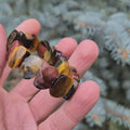 Imaginează-ți cum porți la încheietură această brățară elastică, realizată din pietre de ochi de tigru, cu reflexii hipnotice de auriu și maro, care par să capteze energia pământului și strălucirea soarelui într-un dans subtil de lumină și forță.