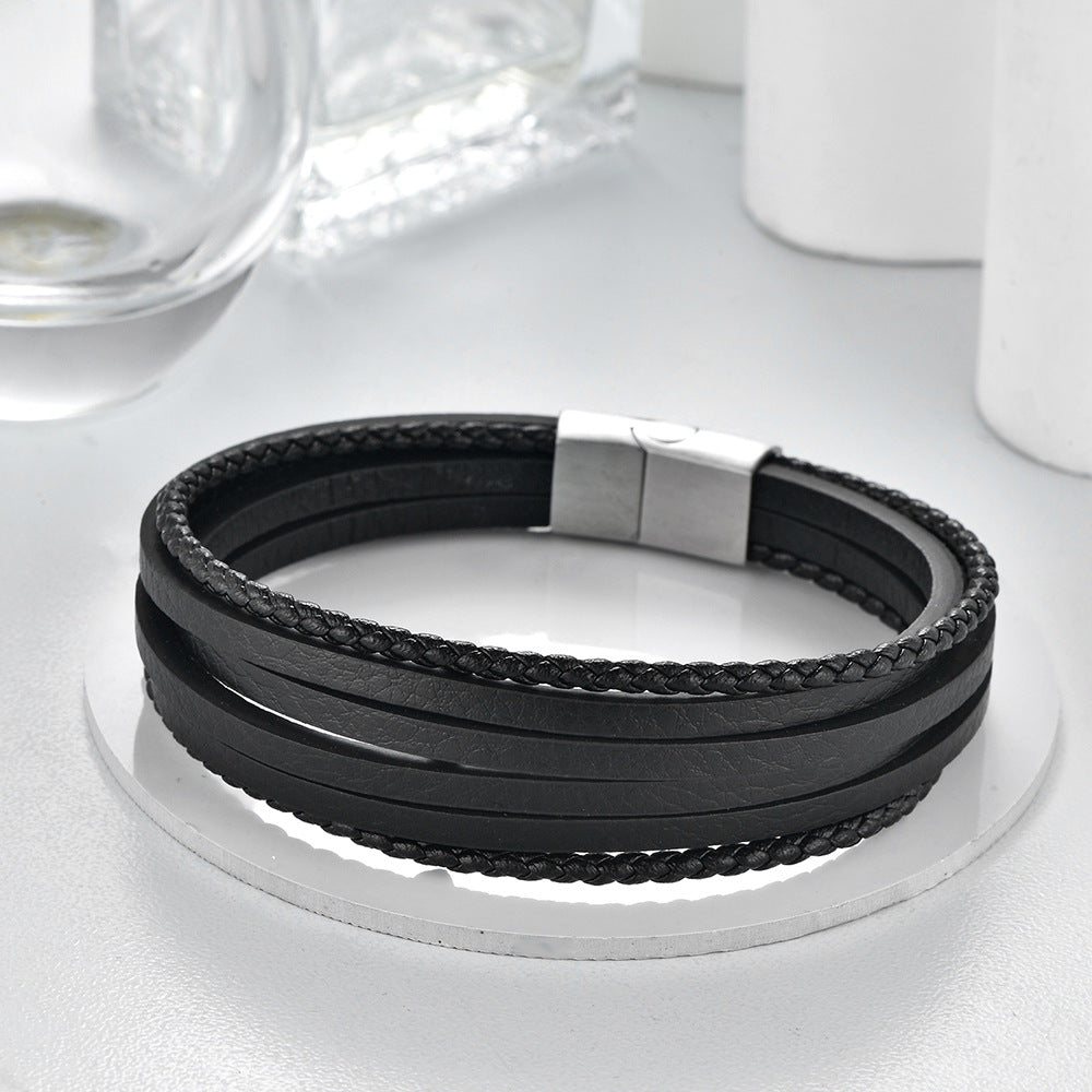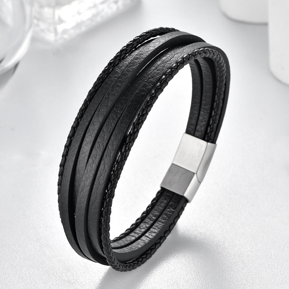 Brățara Classic Black: Eleganță atemporală definită de pielea naturală autentică și oțelul inoxidabil finisat periat. Un accesoriu masculin esențial, care combină texturi multiple – benzi netede și împletite – pentru un look sofisticat, robust și versatil, perfect pentru a fi purtat zi de zi.