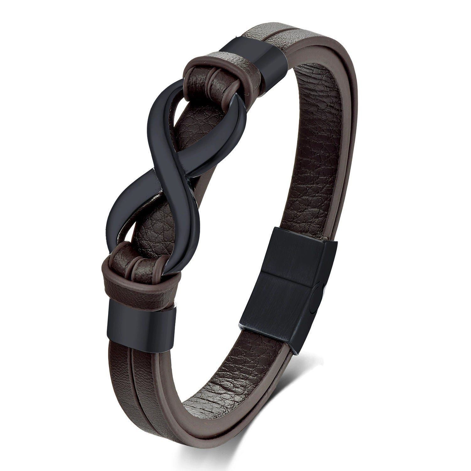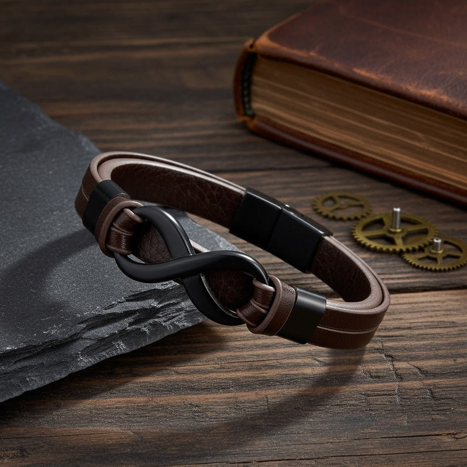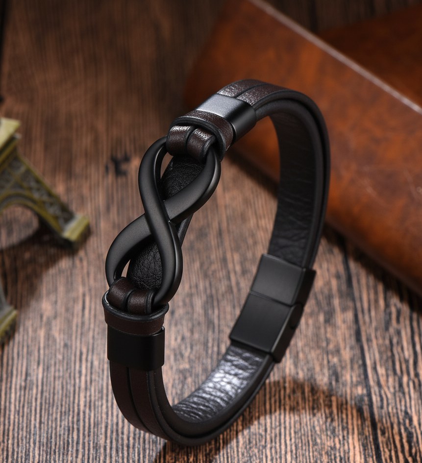 Piesa centrală, de o masculinitate robustă, este simbolul Infinitului , realizat dintr-un aliaj metalic finisat în negru mat. Contrastul puternic dintre maroul cald al pielii și negrul intens al metalului creează un impact vizual imediat, robust și rafinat. Închiderea magnetică, de asemenea neagră, asigură o fixare sigură și discretă.