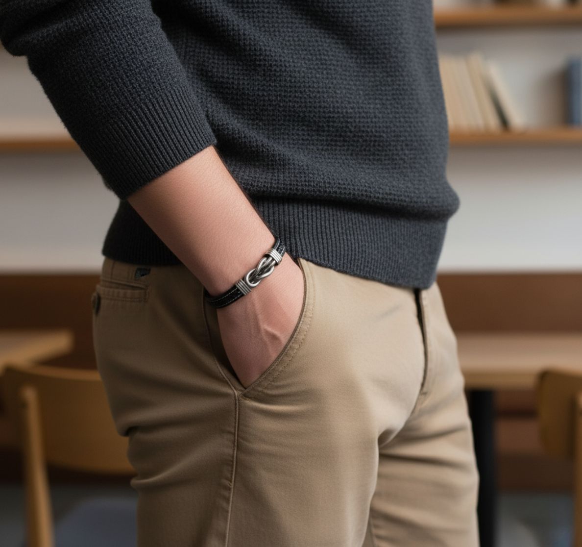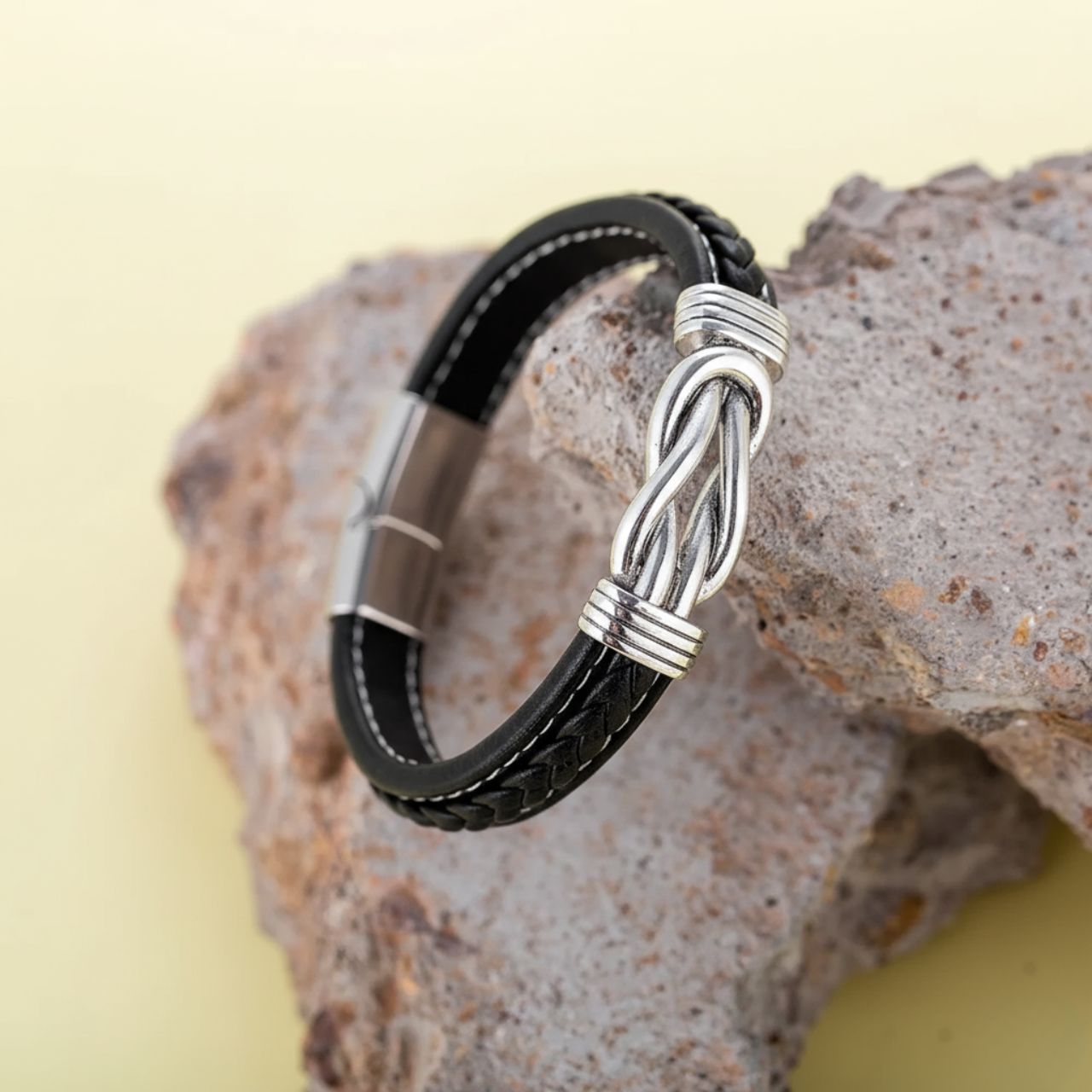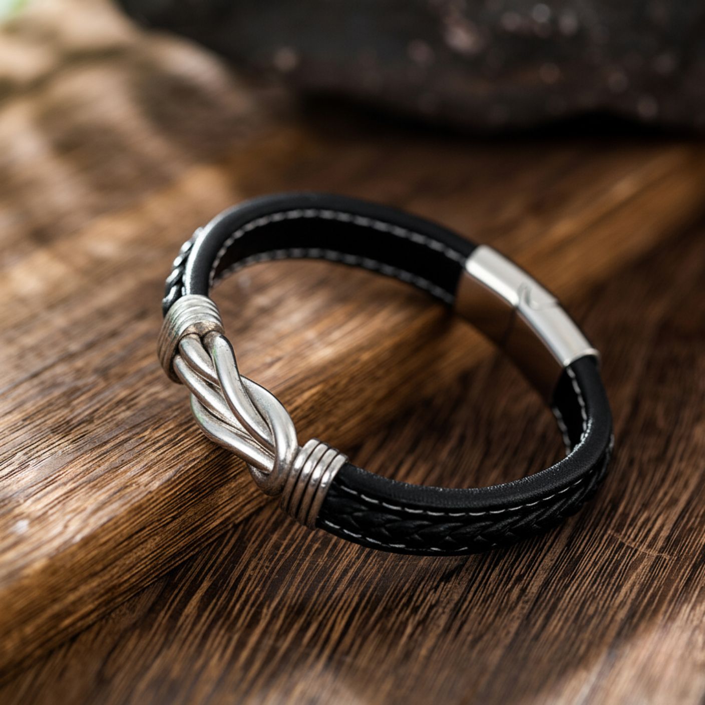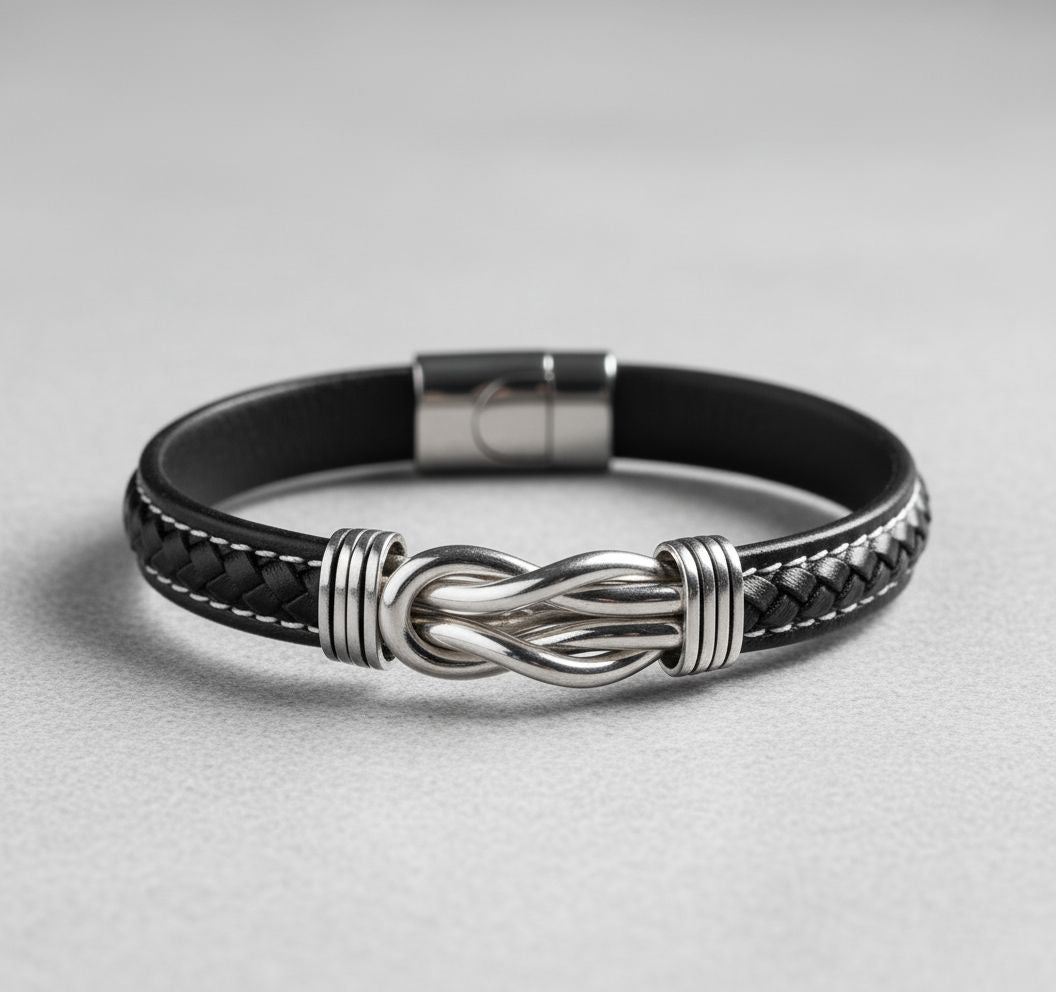 O bratara gândită special pentru bărbatul cu spirit, combină eleganța rebelă a pielii negre cu cusături albe distinctive cu un nod metalic fascinant, un simbol al destinului și al legăturilor ce te definesc.