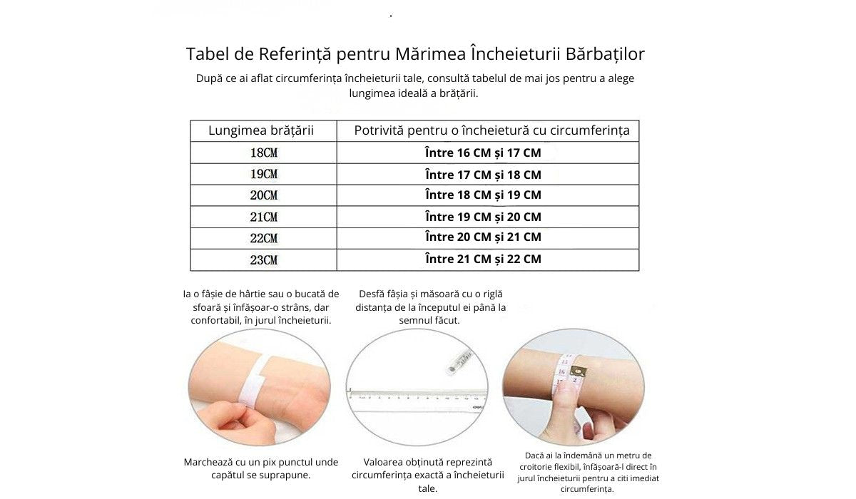 - Pentru o potrivire lejeră, alege o brățară cu 1-1.5 cm mai lungă decât circumferința încheieturii tale
