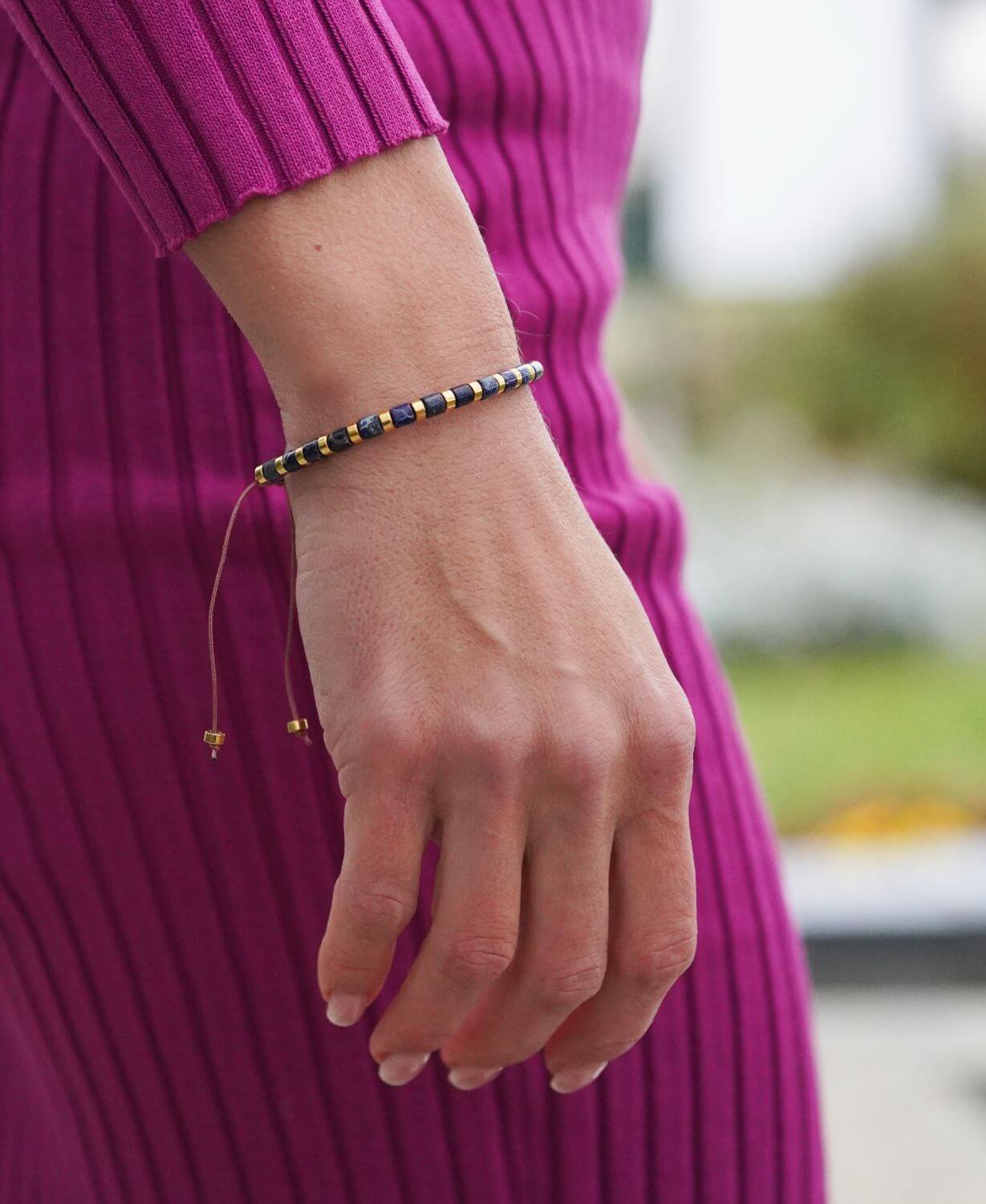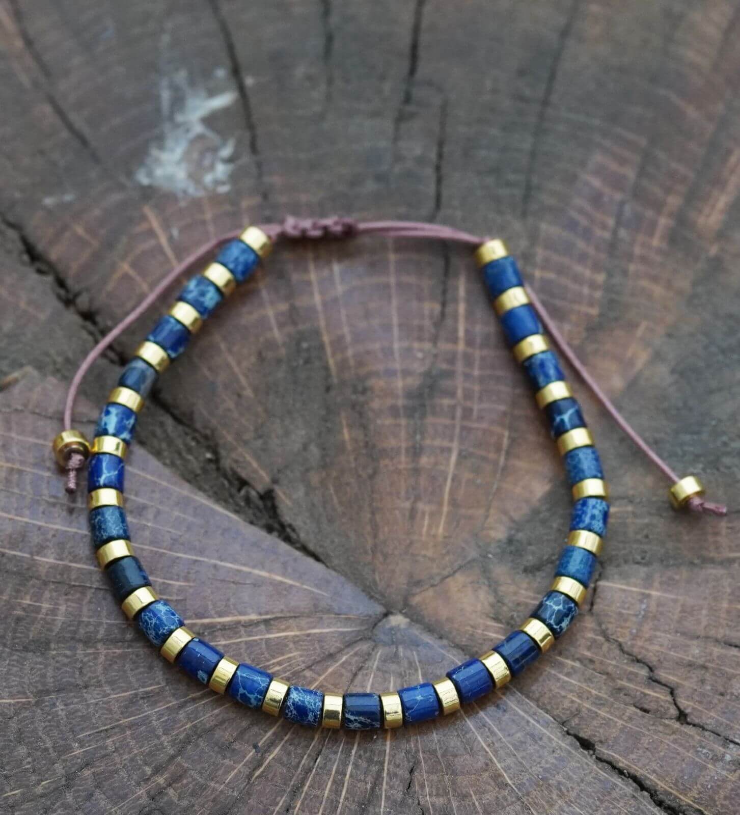O brățară care îți aduce succesul mai aproape! Reglabilă, cu mărgele din jasp imperial albastru, această bijuterie este un talisman plin de energie benefică.
