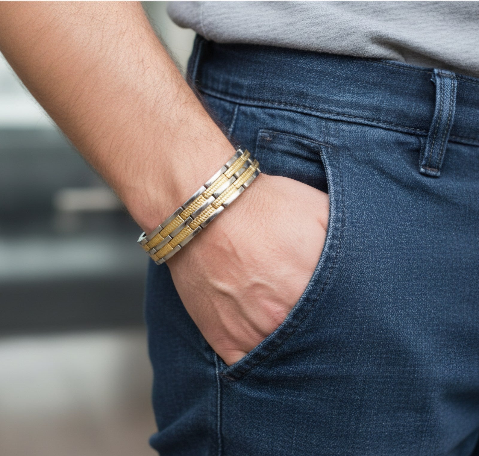 Confecționată cu grijă din oțel inoxidabil de înaltă calitate, această brățară se remarcă prin durabilitatea și rezistența sa extraordinară. Este o bijuterie pe care te poți baza, rezistentă la uzură și prietenoasă cu pielea, fiind hipoalergenică. Designul său bicolor, ce îmbină cu rafinament tonuri de argintiu și auriu, cu zale late și texturi bogate, îi conferă o alură de forță și eleganță.
