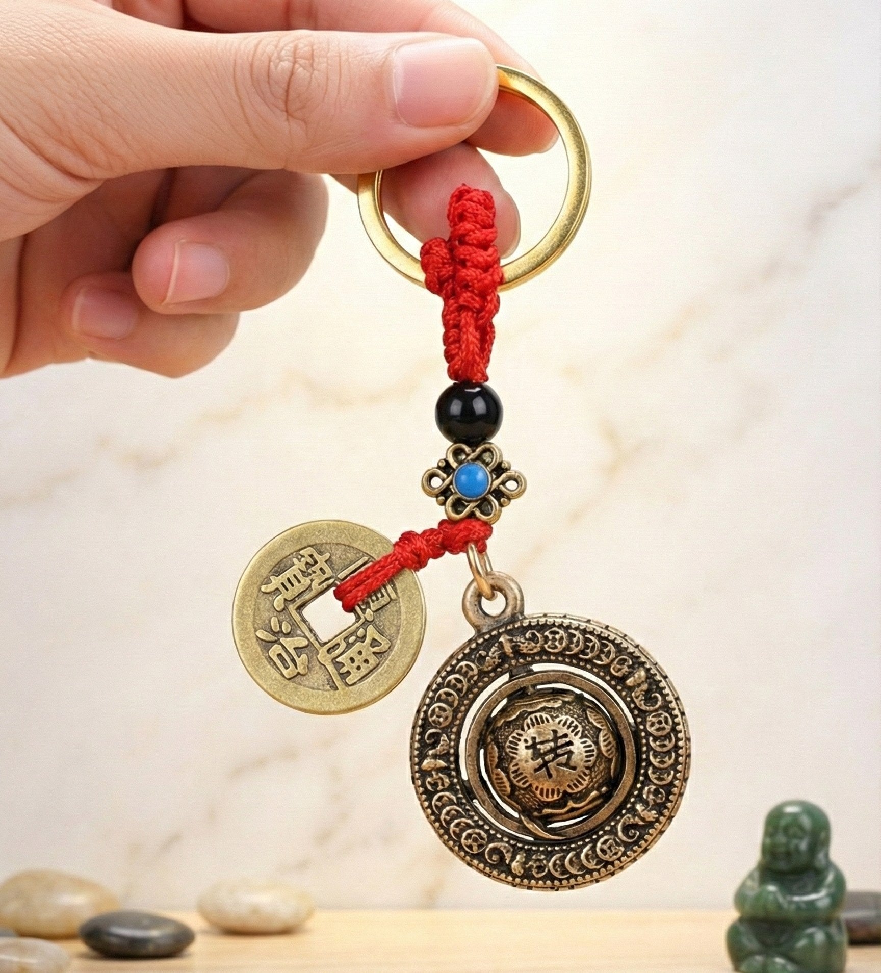 2026 este Anul Calului de Foc, un an al vitezei și mișcării. Acest breloc "Amuleta Călătoriilor" este un remediu Feng Shui esențial, creat pentru protecție la drum. Piesa centrală este un glob pământesc stilizat care se rotește, activând simbolic norocul în orice colț al lumii. Este amuleta perfectă pentru cheile mașinii.