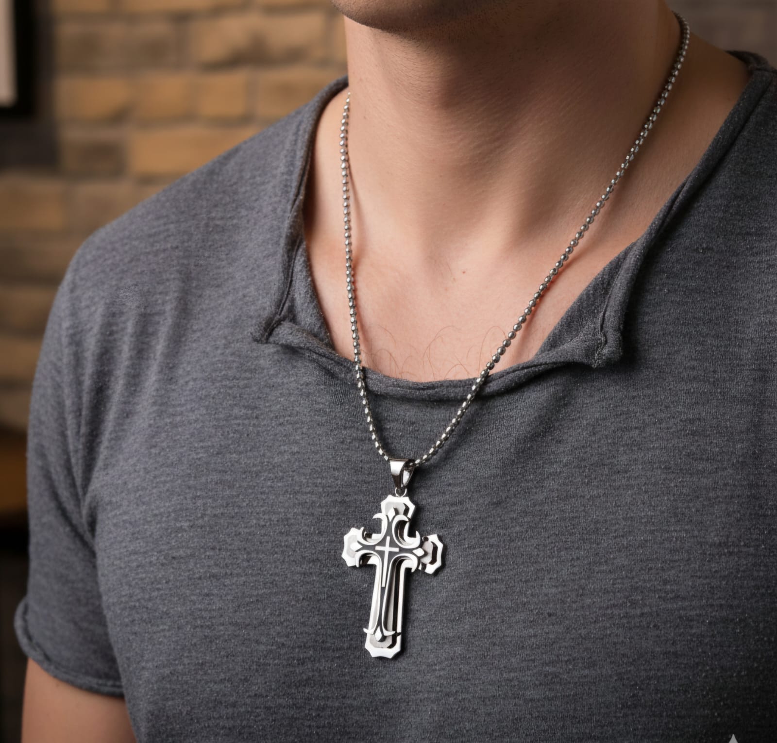 Pandantivul sub formă de cruce este realizat cu o măiestrie deosebită, având un design stratificat și detaliat, ce îi conferă o textură și o profunzime vizuală remarcabilă. Liniile curate și finisajul său metalic (precum oțelul sau un aliaj rezistent) îi oferă un aspect robust, modern și versatil, ușor de asortat atât la ținute casual, cât și la cele mai rafinate.