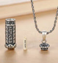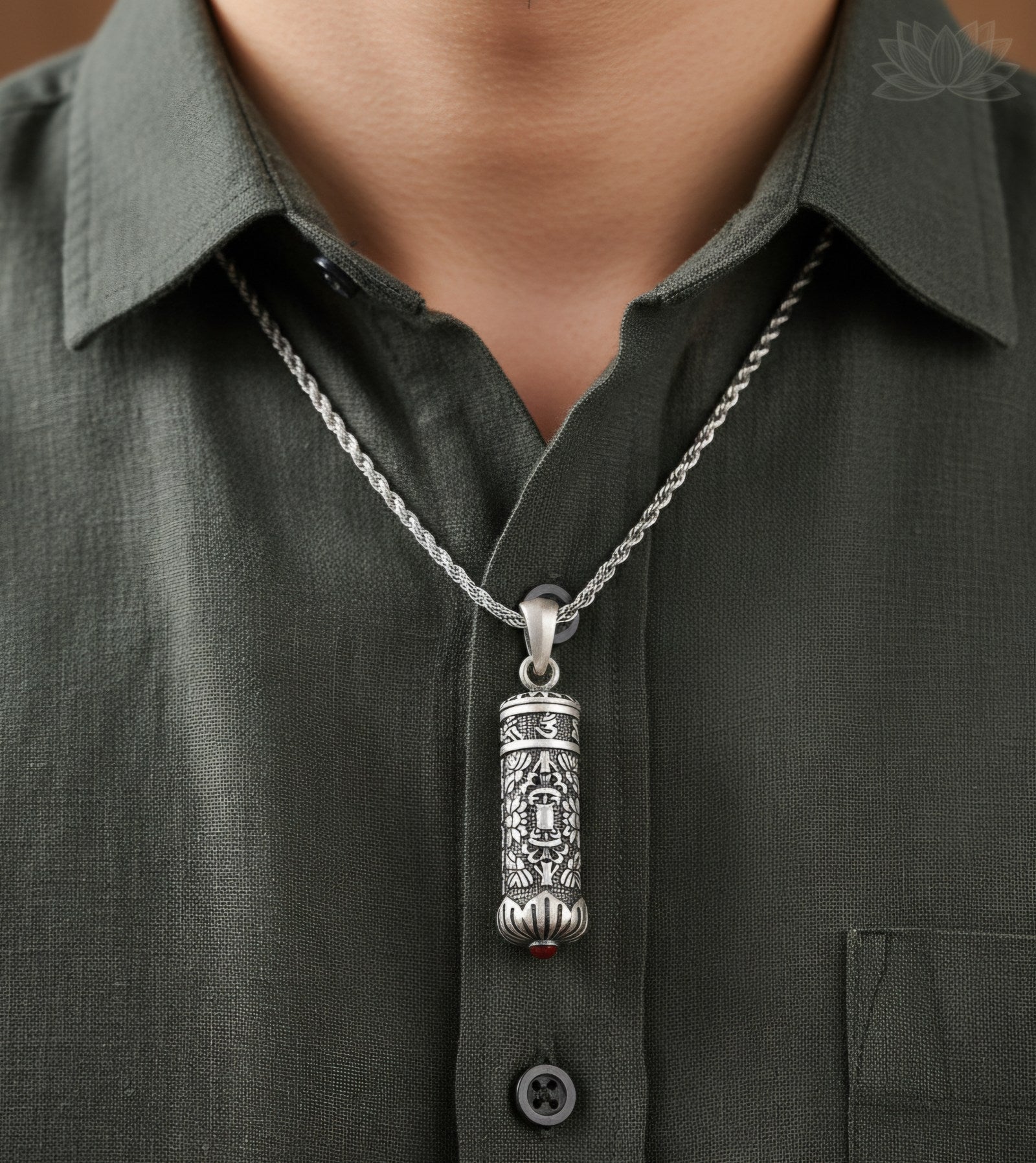 Designul său cilindric, elegant și sobru, este împodobit cu gravuri detaliate de mantre și simboluri tibetane sacre, care aduc protecție, binecuvântare și purificare. Fiecare linie și fiecare contur spun o poveste a înțelepciunii ancestrale, transformând colierul într-o amuletă puternică.
