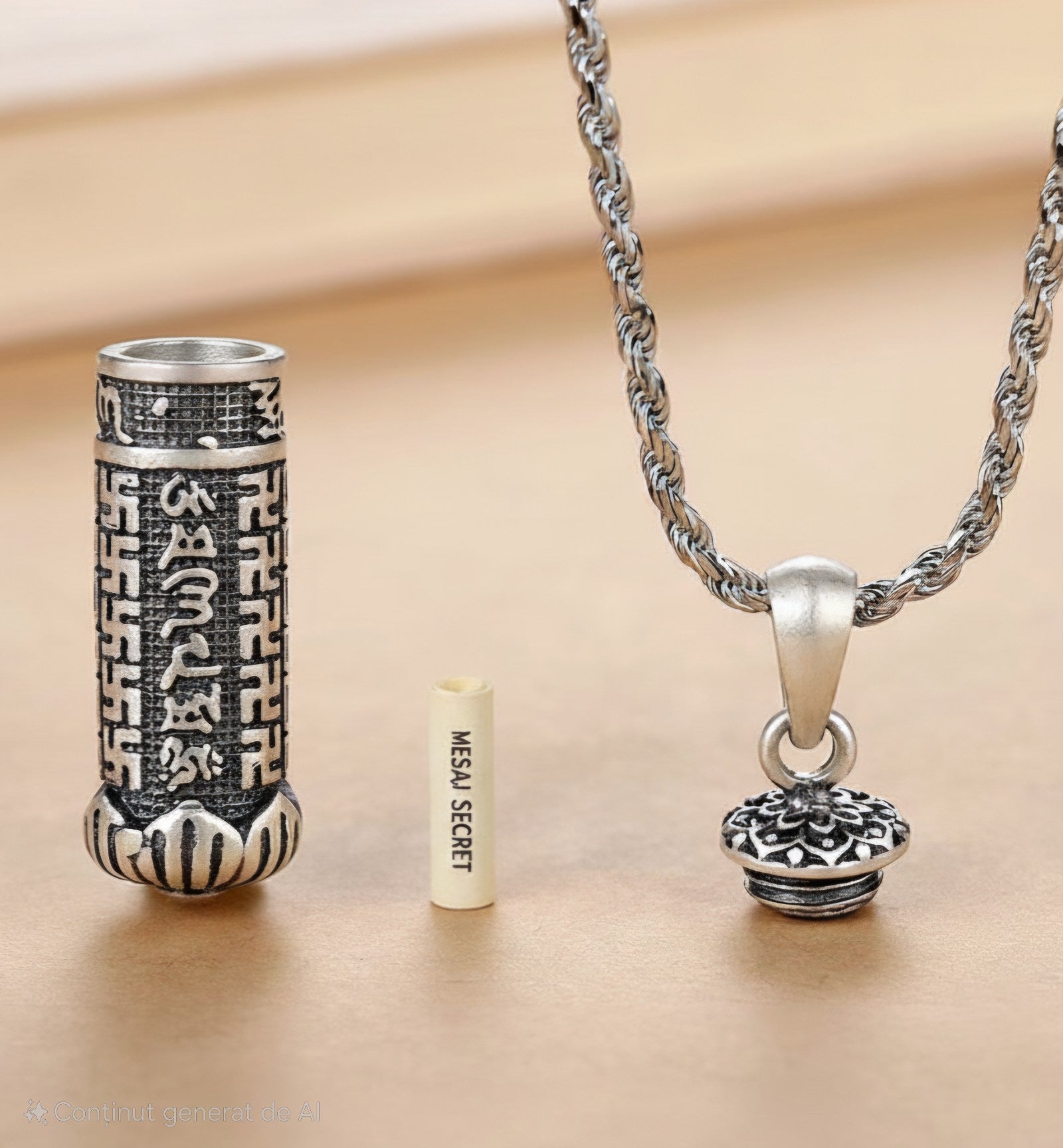 Descoperă un colier cu adevărat magic! Acest pandantiv tibetan, gravat cu simboluri sacre, are un secret: se desfiletează și îți permite să introduci în interior un bilețel cu o dorință, o rugăciune sau o intenție specială