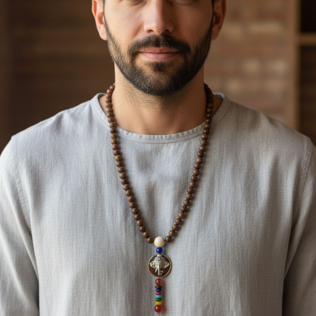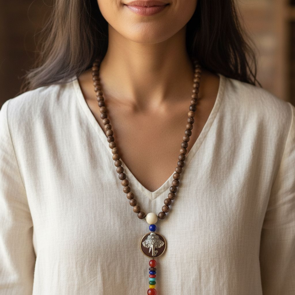 Un colier spiritual, cu mărgele din lemn natural, ce aduce o energie de împământare. Piesa centrală este un pandantiv cu Elefant (simbolul înțelepciunii și norocului), completat de un șirag vertical ce reprezintă cele 7 Chakre. O amuletă puternică, purtată pentru echilibru energetic, calm mental și protecție.