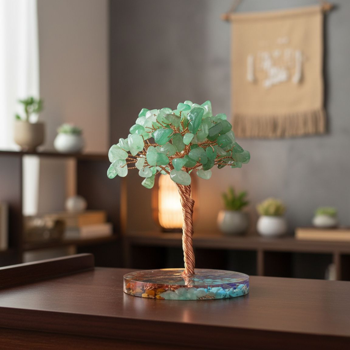 Acest copăcel feng shui elegant este împodobit cu pietricele de aventurin verde și are un trunchi de cupru răsucit. Baza sa din orgonit conține cristale ce reprezintă cele 7 chakre, amplificând energia pozitivă și atrăgând echilibru, noroc și prosperitate în orice spațiu.