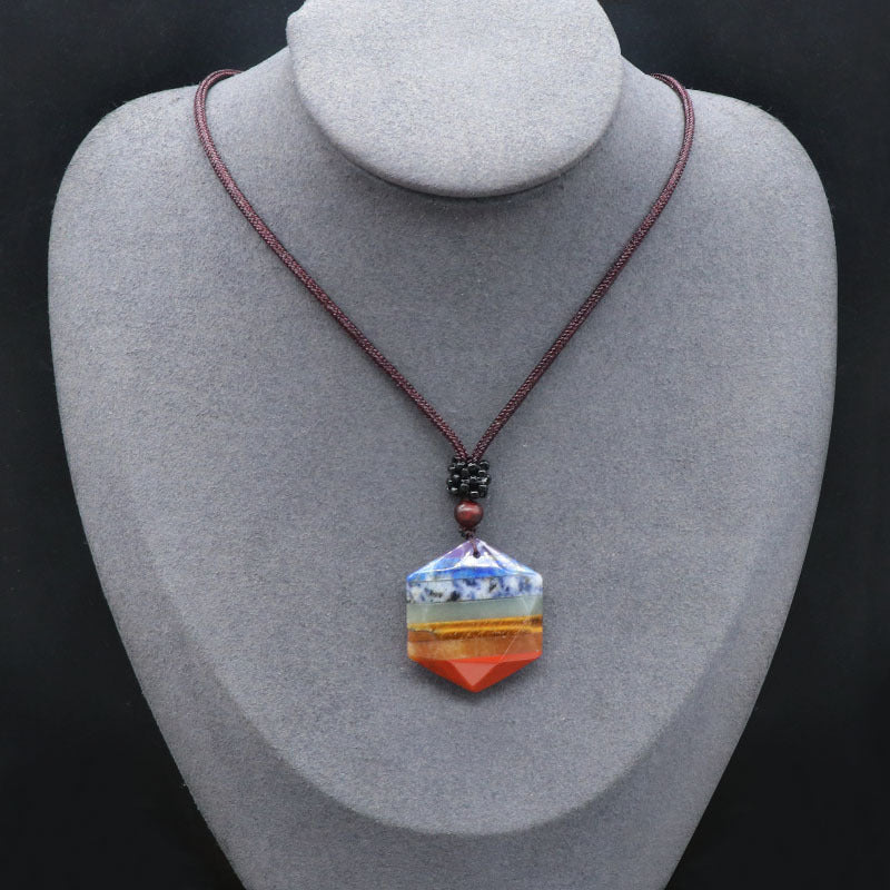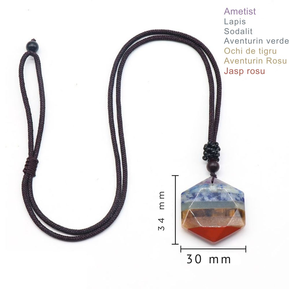 Iată o bijuterie magică pentru tine! Un pandantiv hexagonal, cu șapte straturi de pietre semiprețioase, fiecare reprezentând o chakră. De la ametistul cerului până la jaspul roșu al pământului, acest pandantiv te ajută să-ți armonizezi energiile și să te conectezi cu sinele tău autentic.