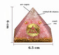Piramida orgonică din cuarț roz și cristal de stâncă, cu un arc elegant din cupru, este o piesă decorativă și energizantă. În centru, simbolul Ochiului lui Horus, înconjurat de soare, aduce protecție, claritate și iluminare spirituală, atrăgând energii pozitive și armonizând spațiul.