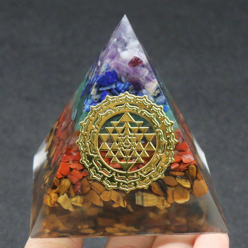 Această piramidă orgonică cu 7 chakre este o bijuterie energetică handmade, realizată din rășină organică și cristale naturale precum ochi de tigru, carneol, jasp roșu, aventurin verde, lapis lazuli, ametist și cuarț de stâncă. Concepută pentru a armoniza energiile corpului și spațiului tău, ea amplifică vibrațiile pozitive, promovează echilibrul chakrelor și creează un mediu calm și protector în casă. Ideală pentru meditație, vindecare și decor spiritual.