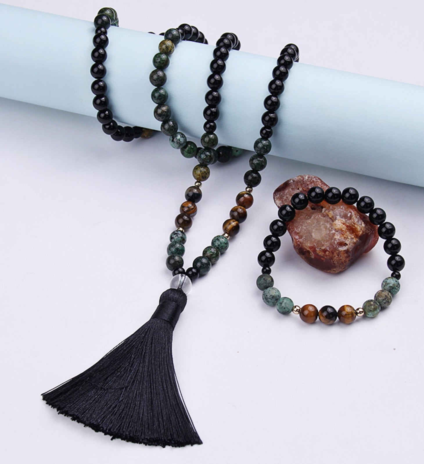 Acest set combină eleganța naturală cu energii protectoare și echilibrante. Realizat cu mărgele de onix, turcoaz african și ochi de tigru, acest colier și brățară te însoțesc cu stil și semnificație.