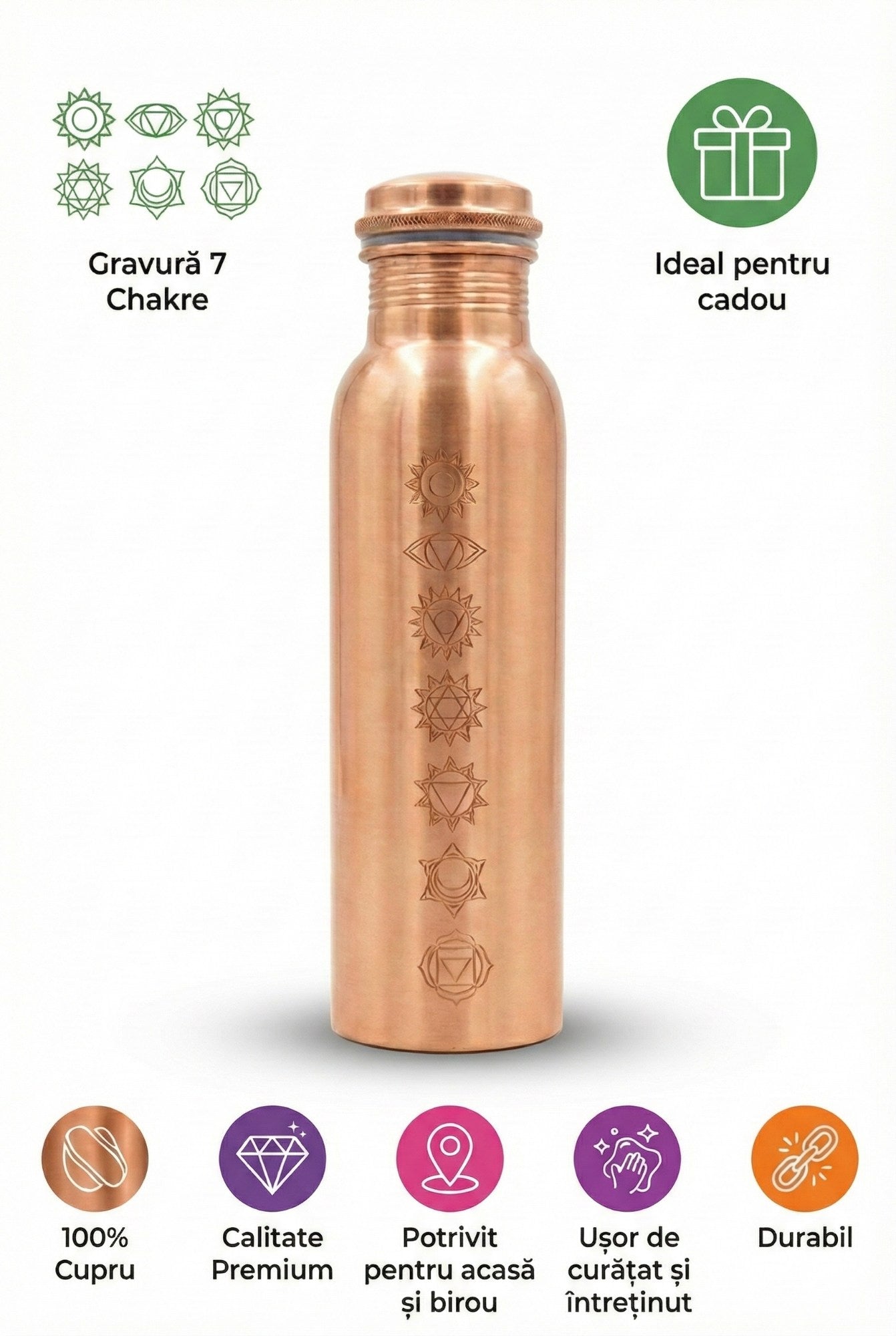 Sticla din cupru 7 Chakre este alegerea perfectă pentru o hidratare sănătoasă! Este ideala pentru a pastra apa, datorită proprietăților ei antibacteriene și conductive termic.