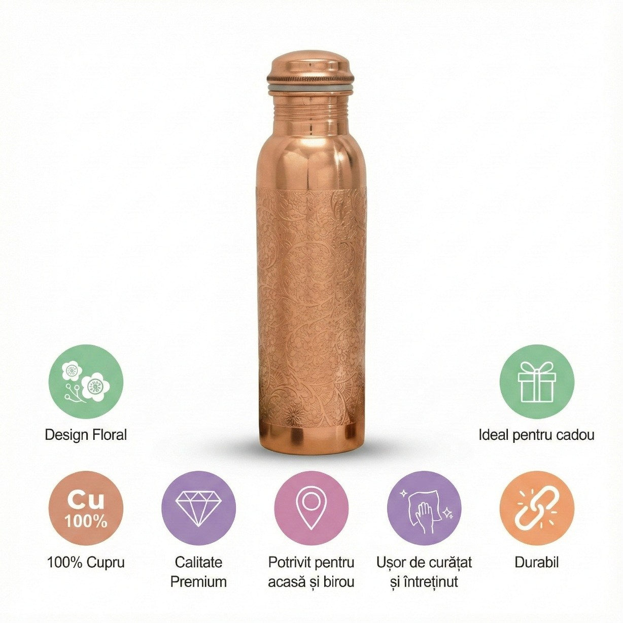 Sticla de apă din cupru cu gravură florală oferă beneficii naturale pentru sănătate datorită proprietăților antibacteriene și antiinflamatorii ale cuprului.