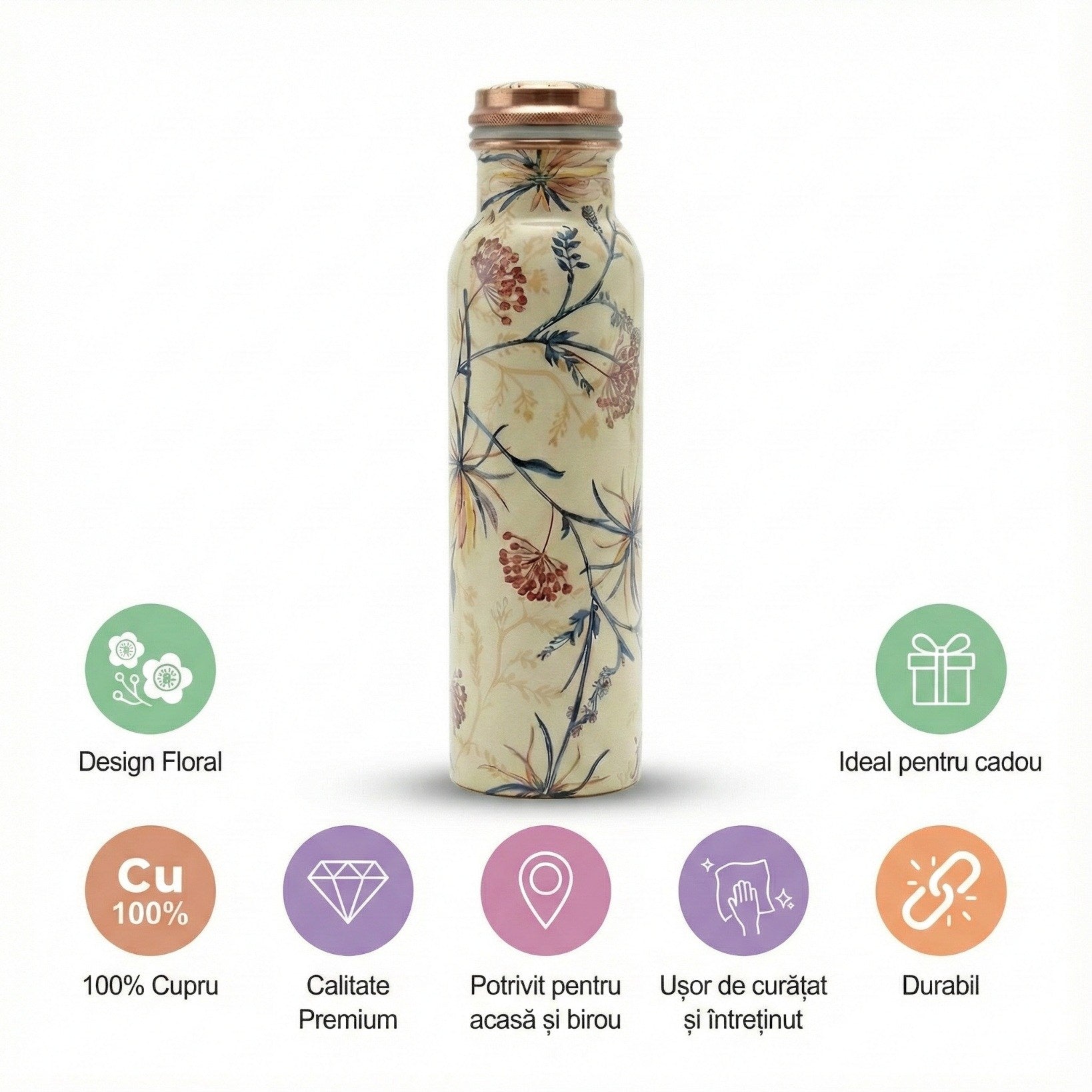 Această sticlă rafinată din cupru este companionul ideal pentru rutina ta zilnică de hidratare. Cu un design inspirat de frumusețea florilor de câmp și lumina caldă a răsăritului, Wildflower Sunshine îmbină tradiția milenară a folosirii cuprului cu un stil contemporan, practic și elegant.